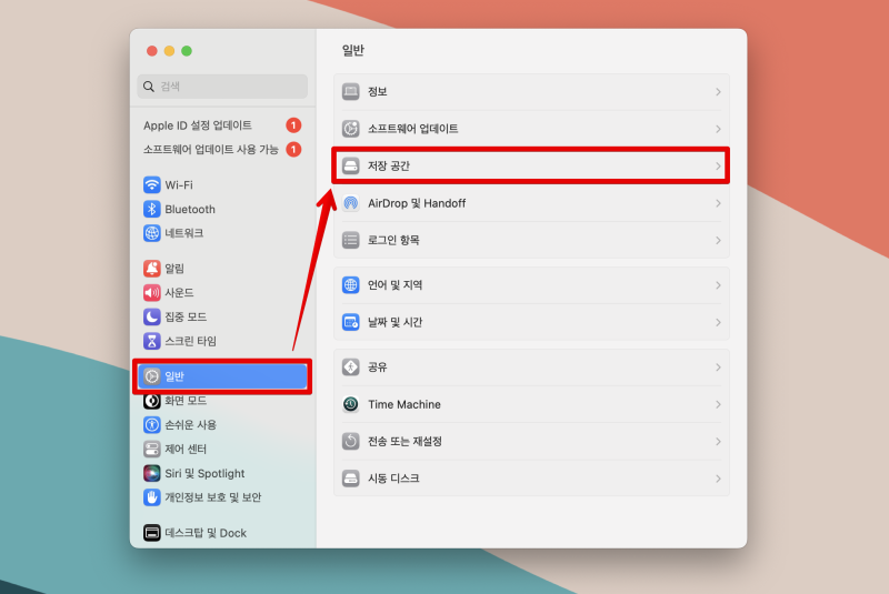 그러면 시스템 설정 탭이 나타납니다. [일반] – [저장공간] 탭에 들어가면 현재 MacBook 용량을 확인할 수 있습니다. 제 경우는 용량이 1TB인데 이미 980GB가 꽉 찼네요. 하단에는 용량별 카테고리가 정리되어 있습니다. 일반적으로 문서/응용 프로그램이 가장 많은 공간을 차지합니다. 이것을 선택하세요. MacBook에서 저장 공간을 정리하는 방법